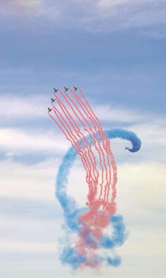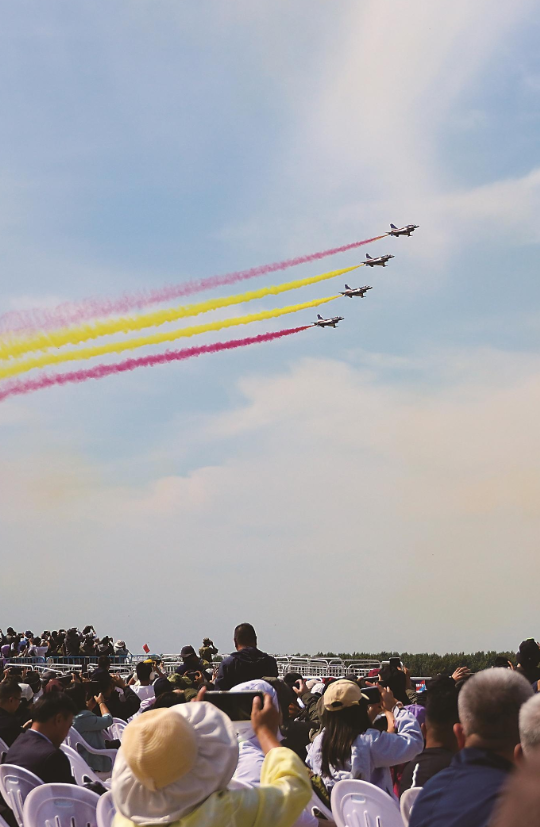 参加表演的“八一”飞行表演队在天空上拉出一道道绚丽的弧线。潘硕 摄