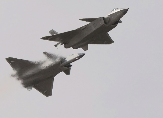 歼-20编队进行机动飞行展示。颜麟蕴 摄