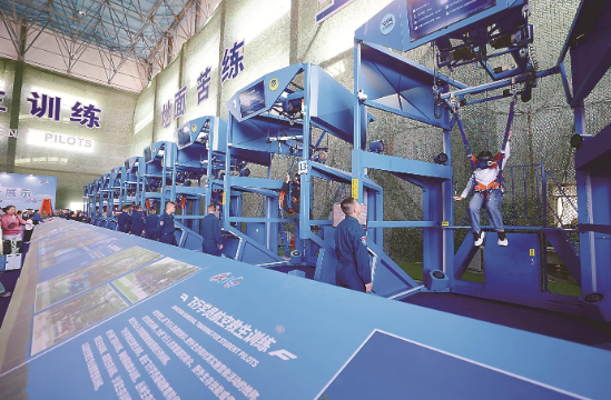 游客们正在体验“模拟跳伞”。潘硕 摄