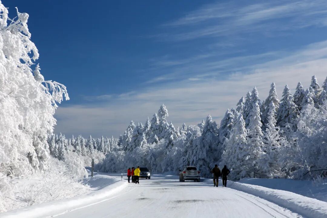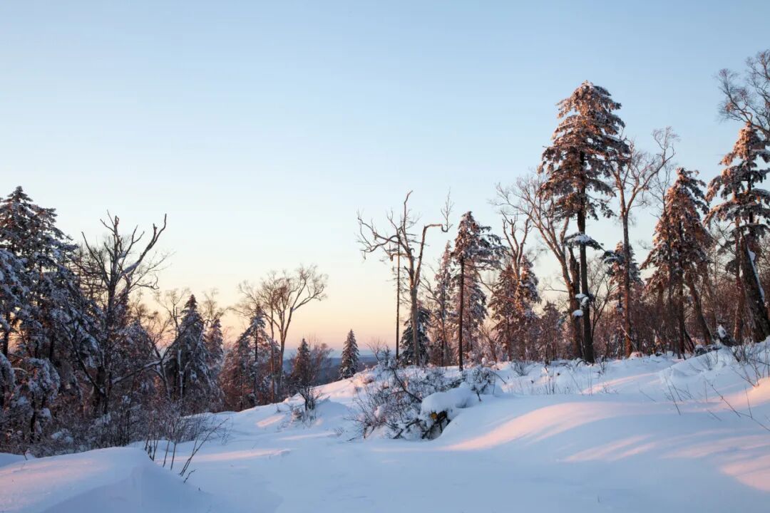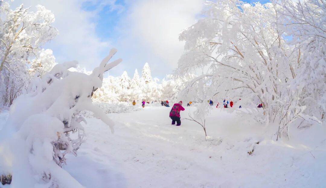 雪岭又称老爷岭,海拔1460米。每年11月,西伯利亚的寒冷气流和日本海的暖湿气流都会如约而至。冷暖气流的交汇造就了千里冰封、万里雪飘的壮美之景,一个雪域王国、一方梦幻之地,就这样被大自然的鬼斧神工刻画出来。