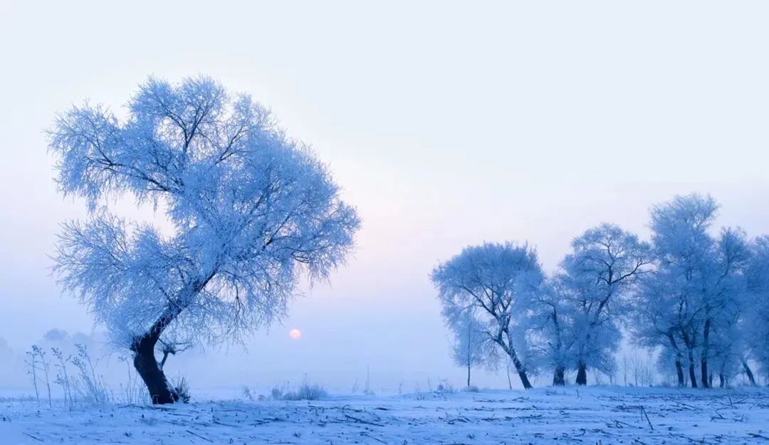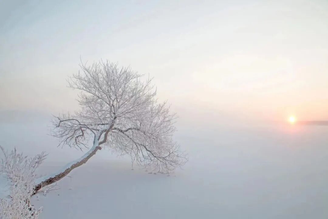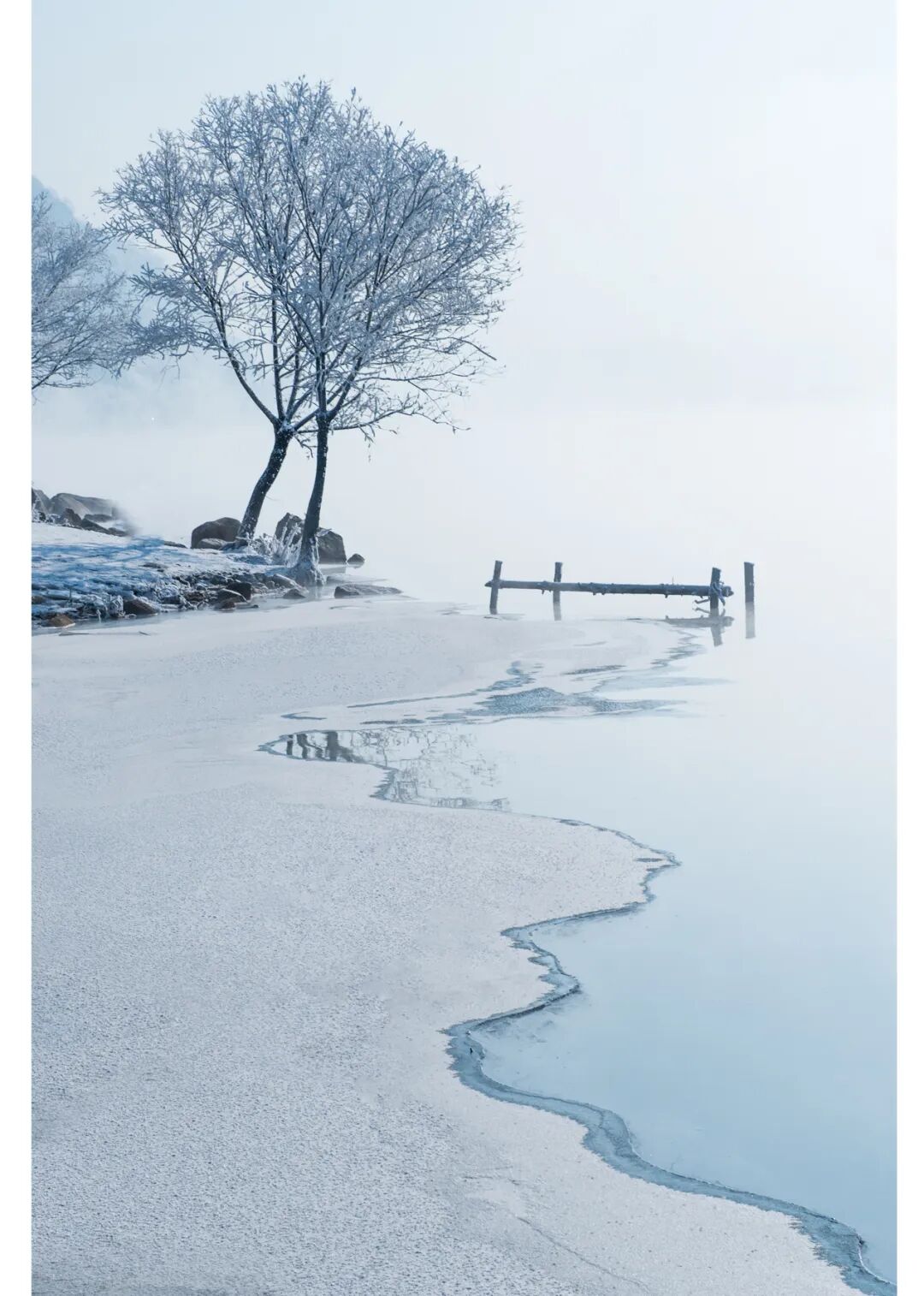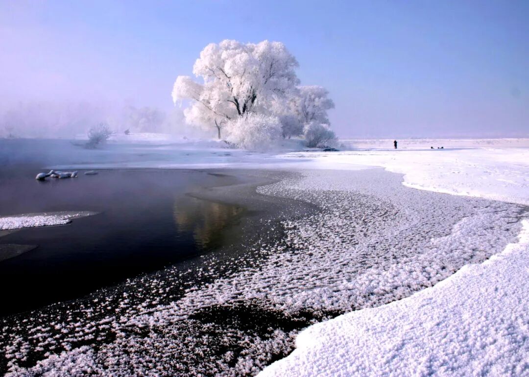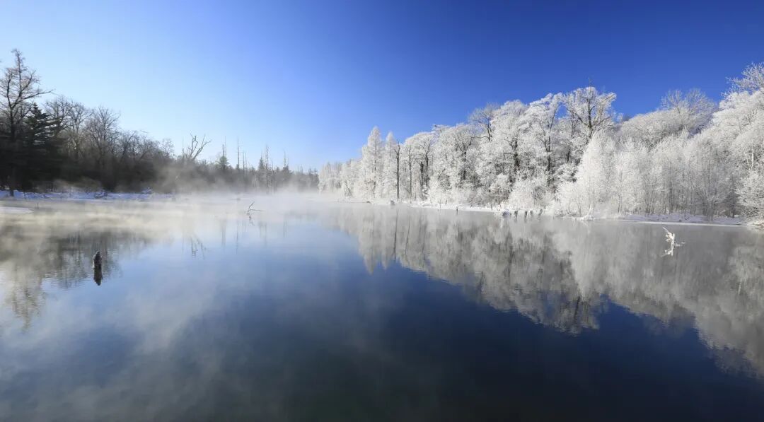 流动的河流上雾气缭绕,凝结在树枝上,雾凇玲珑剔透,绵延百里,与湛蓝天空相映,阳光穿过云层,洒金泼墨一般,蔚为壮观。