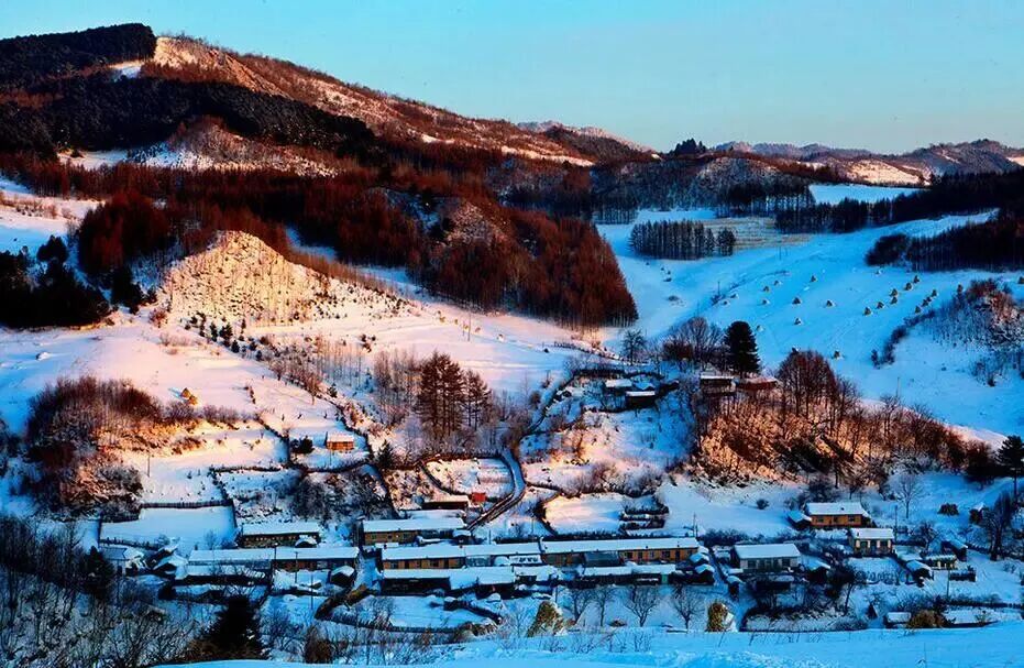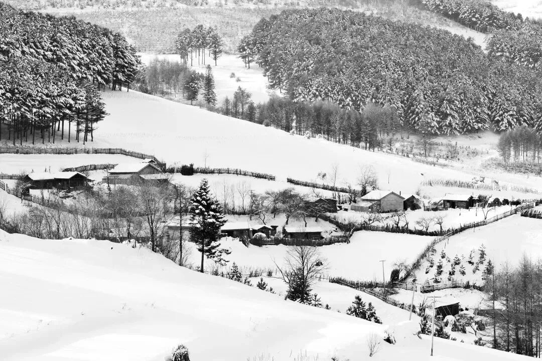 冬季,大雪覆盖的小山村一片洁白,远山近岭在农舍升起的缕缕炊烟在淡淡的雪雾中若隐若现,令人飘飘然仿佛置身于人间仙境。