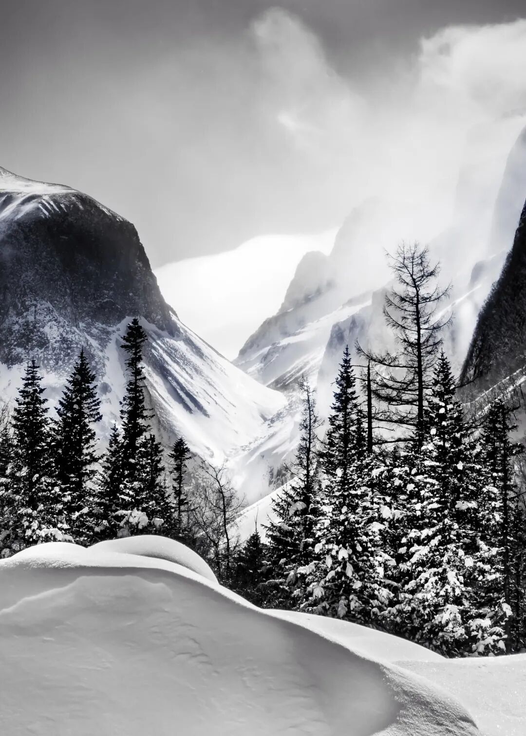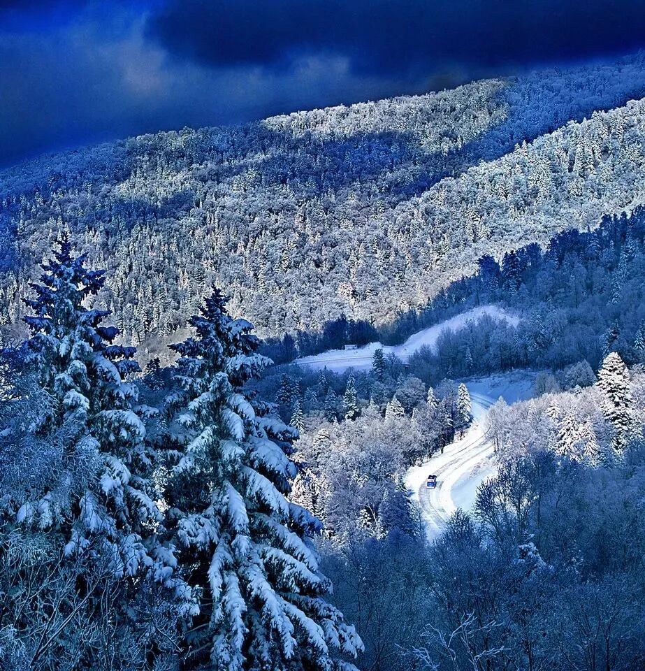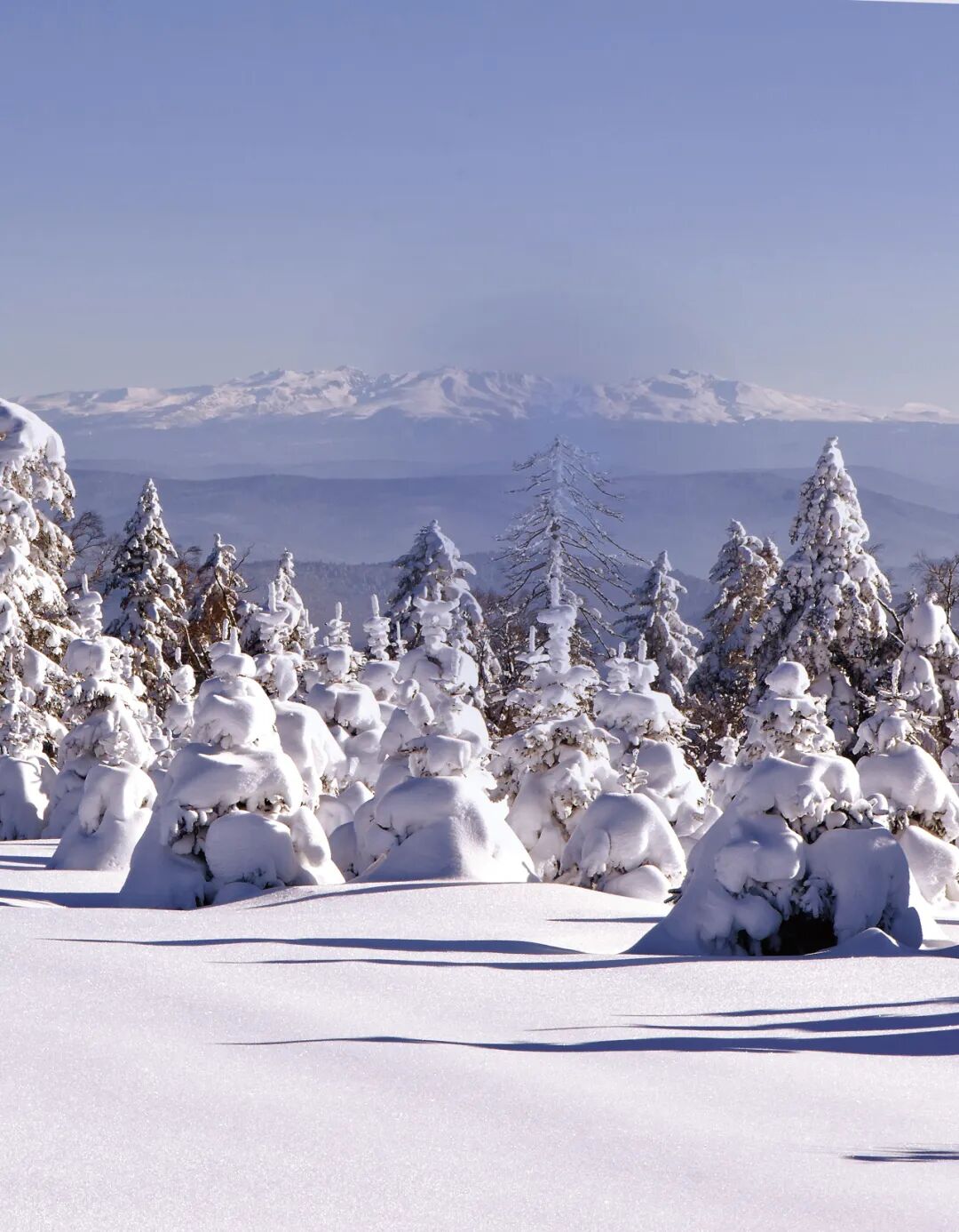 这里是山峦中的雪域天堂,通往山上的路泛着银光,林海雪原,隼影鹿踪,雪花如席,山披银装,山峰被皑皑白雪覆盖,片片山林雪压枝头,千百年存留的枯木形态各异,在风寒中岿然挺立。