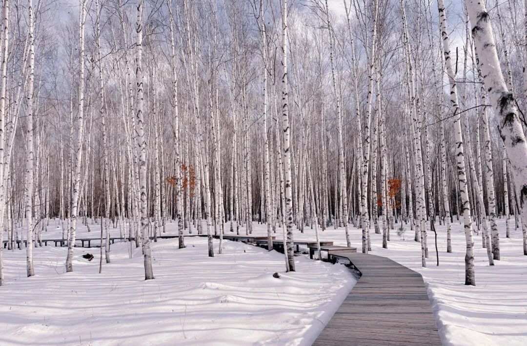 苍茫雪原,巍峨林海,湛蓝的天空,笔直的白桦树,宁静中透着纯洁的美丽。