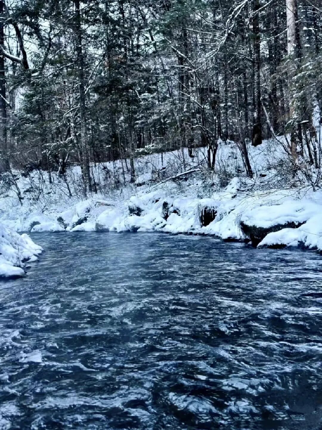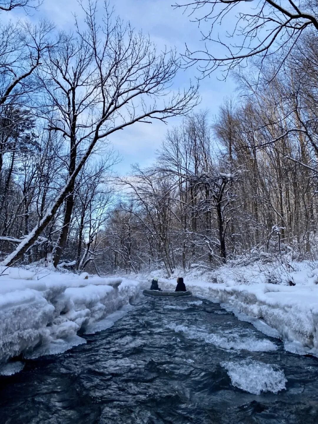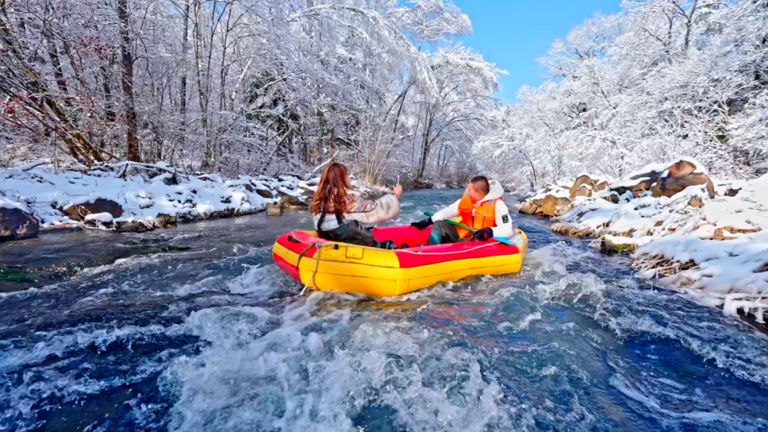 露水河冬季漂流全程2.3公里,河水时急时缓,落差适中,皮艇随着水流转圈圈。