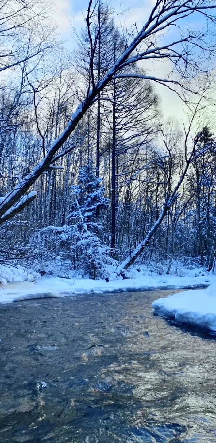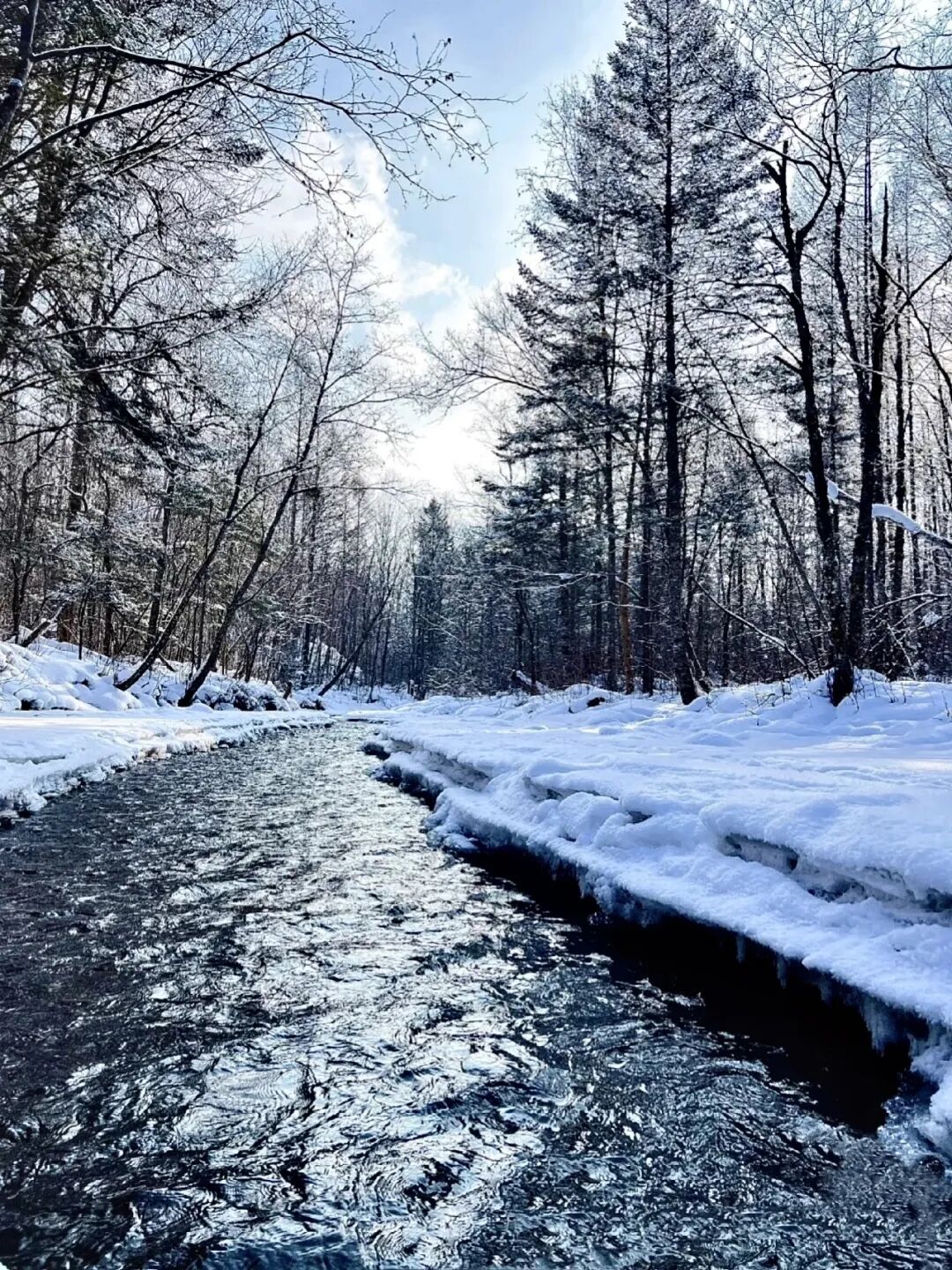 两岸的密林中随处可见雾凇,美不胜收,而且因为植物覆盖率高,这里简直就是一个“天然氧吧”,空气非常清新,溪中偶有鱼儿游过,林间还有飞鸟。